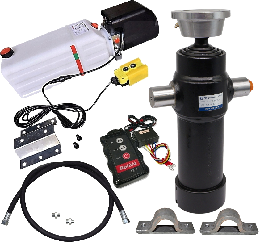 hydraulicznym o skoku 700 mm.Zestaw doskonale sprawdza się w zabudowach z wywrotem w samochodach dostawczych, ciężarowych, lawetach i przyczepach.