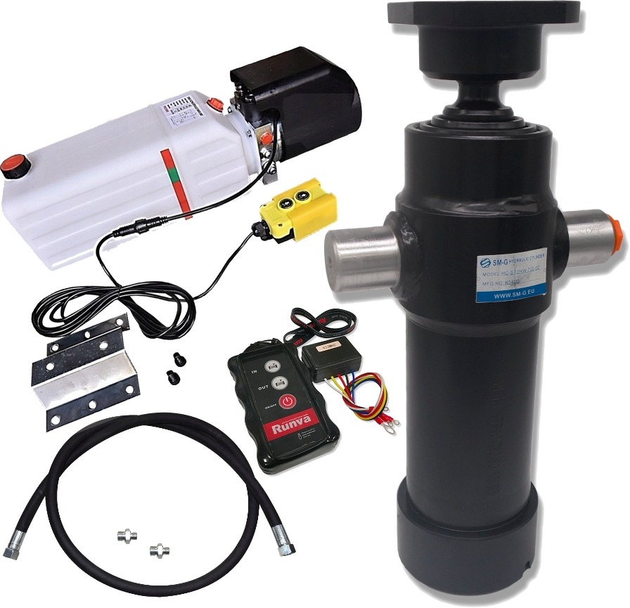 siłownikiem hydraulicznym o skoku 700 mm.Zestaw doskonale sprawdza się w zabudowach z wywrotem w samochodach dostawczych, ciężarowych, lawetach i przyczepach.