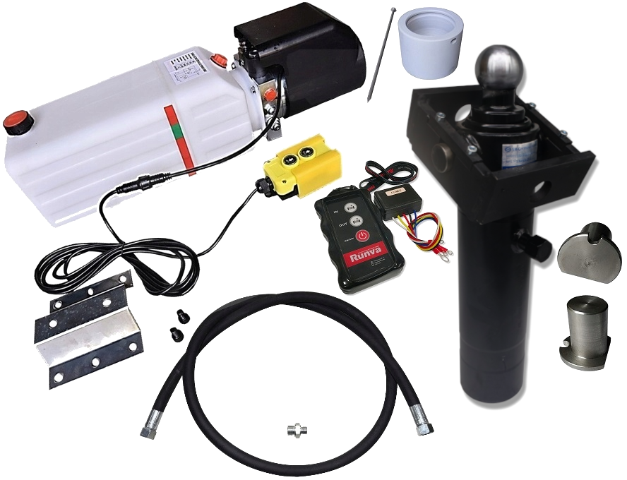 agregatem-pompą, siłownikiem hydraulicznym o skoku 520 mm i kołyską wywrotu na 3 strony + pilot sterowania bezprzewodowegoZestaw doskonale sprawdza się w zabudowach z wywrotem w samochodach osobowych, dostawczych i ciężarowych, ale również można go wykorzystać w przyczepkach dwukołowych do sadownictwa, przyczepkach dwukołowych samochodowych i innych zabudowach o długości do 2m.