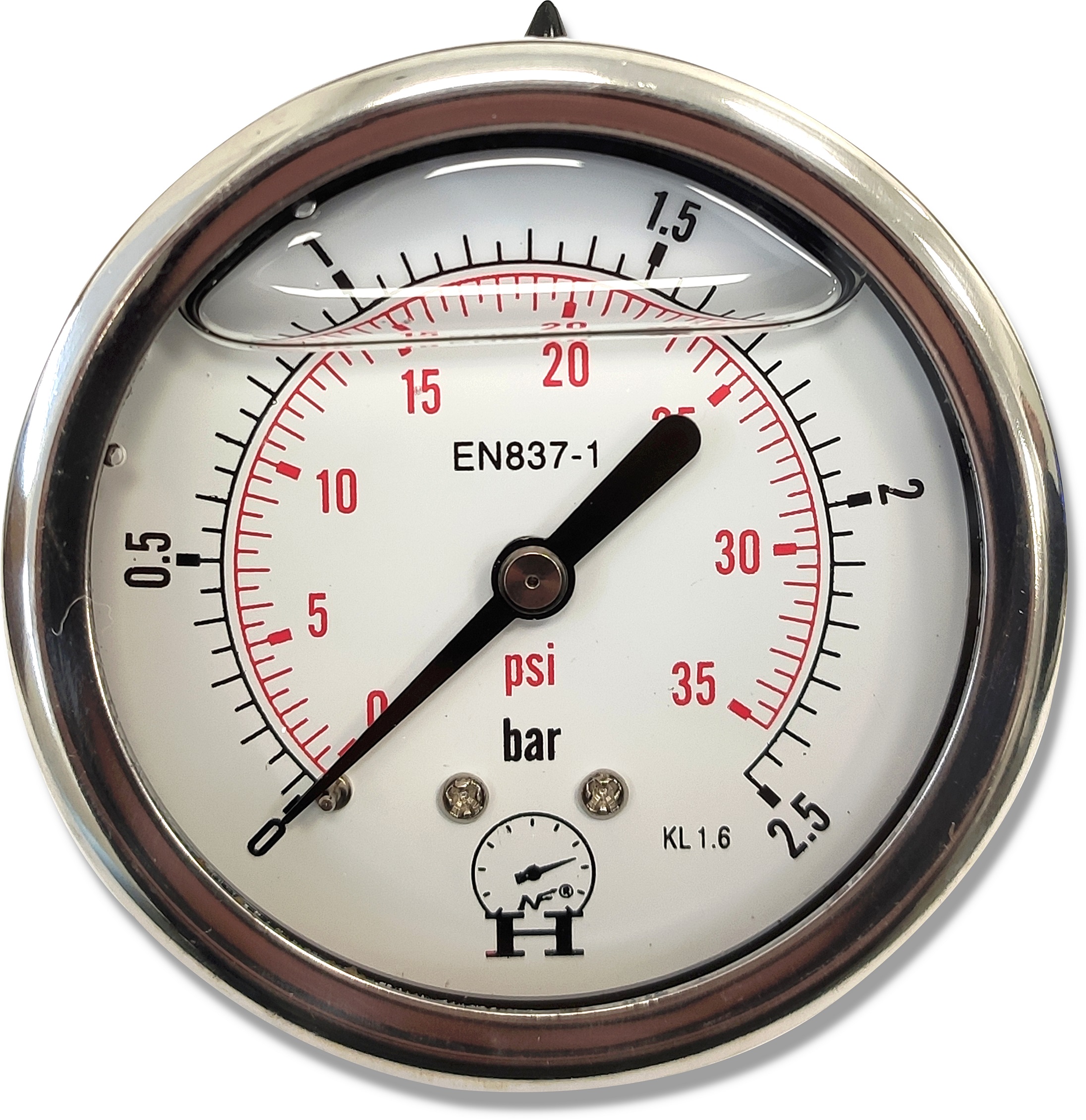 Manometr wewnątrz wypełniony gliceryną. Manometr glicerynowy różni się od standardowych manometrów wnętrzem wypełniony gliceryną, która zabezpiecza i chroni wskazówkę przed wibracjami i drganiami.