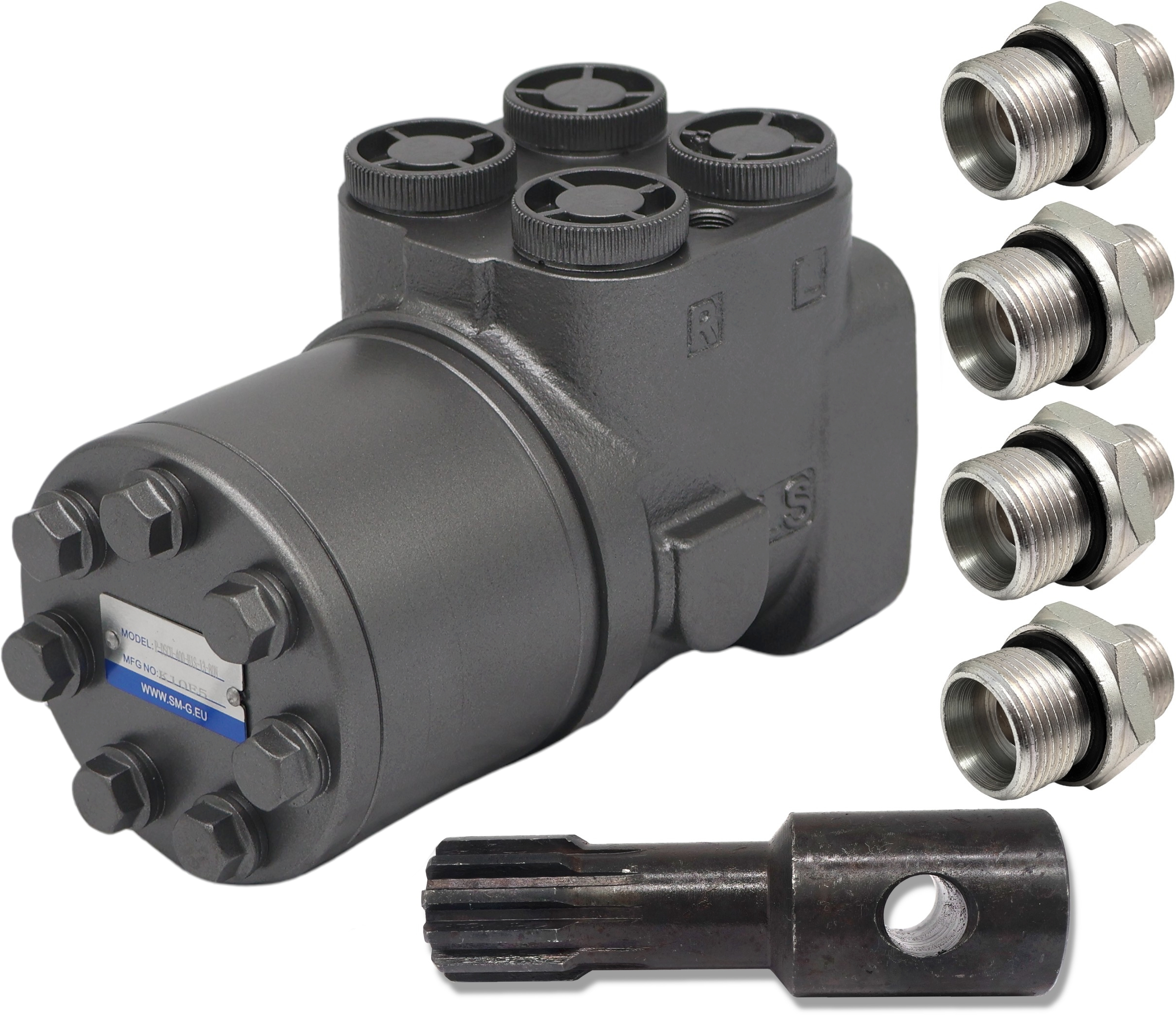 - Każdy orbitrol posiada opisane przyłącza: P, T, R, L, co zapewnia prawidłowe podłączenie do układu