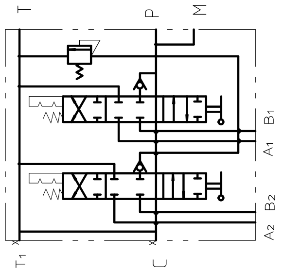 Umożliwia sterowanie dwoma siłownikami dwustronnego działania.