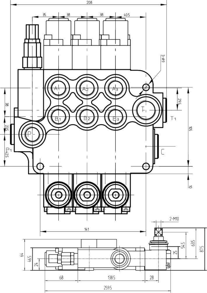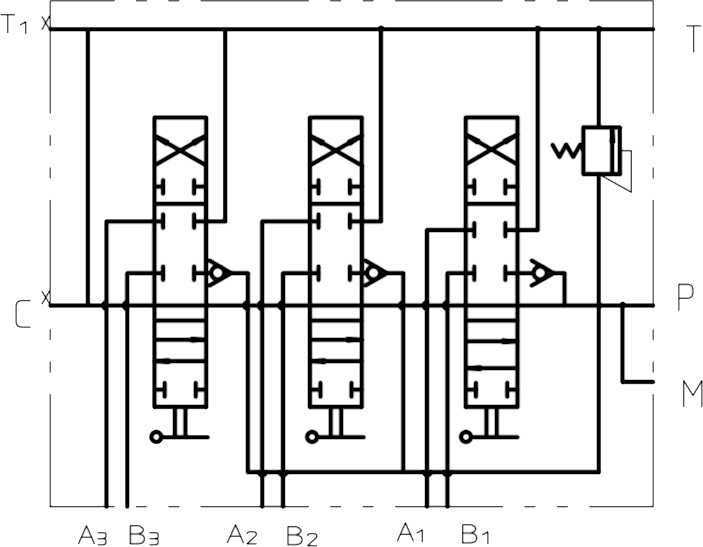 Umożliwia sterowanie trzema siłownikami dwustronnego działania.