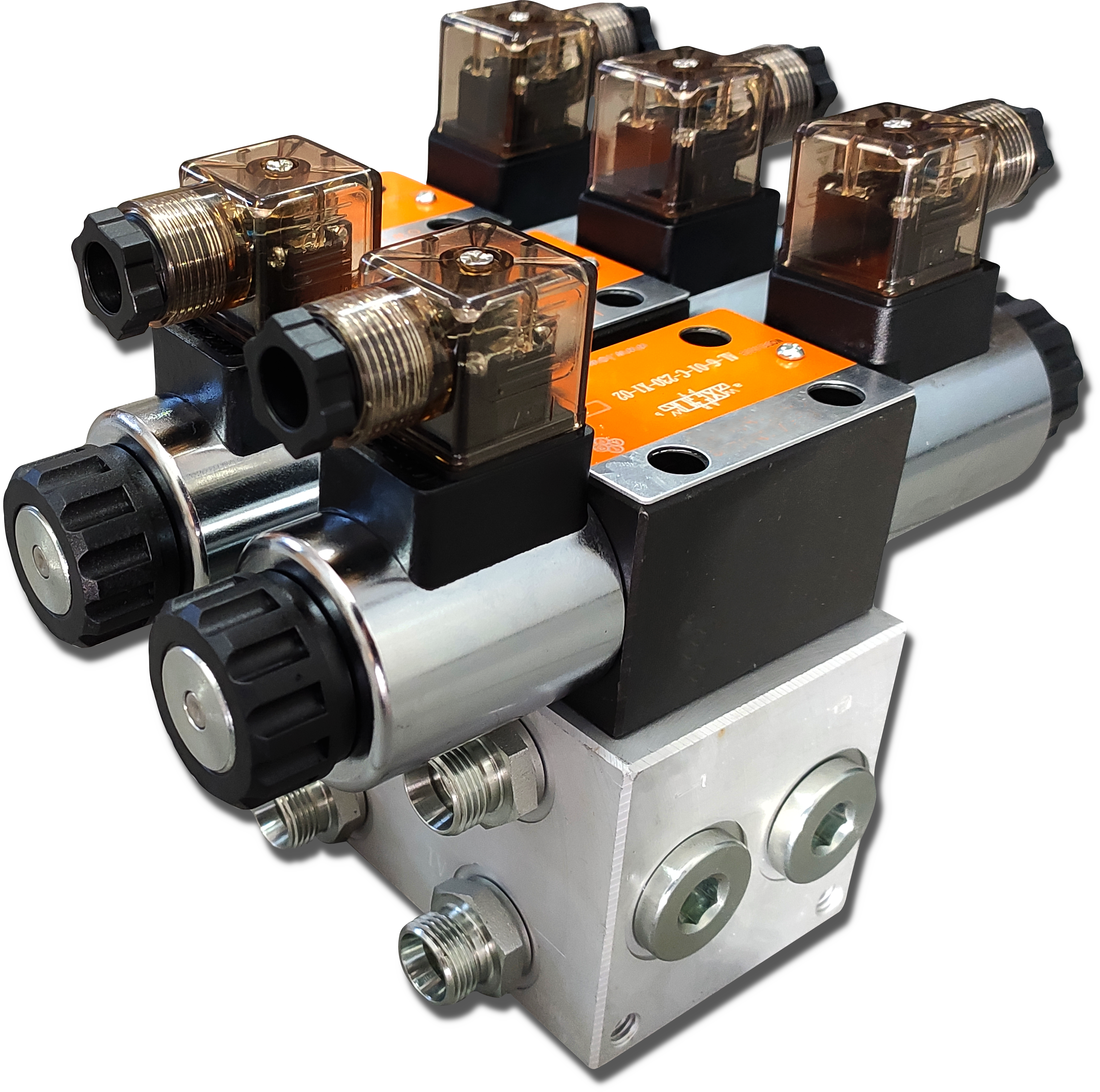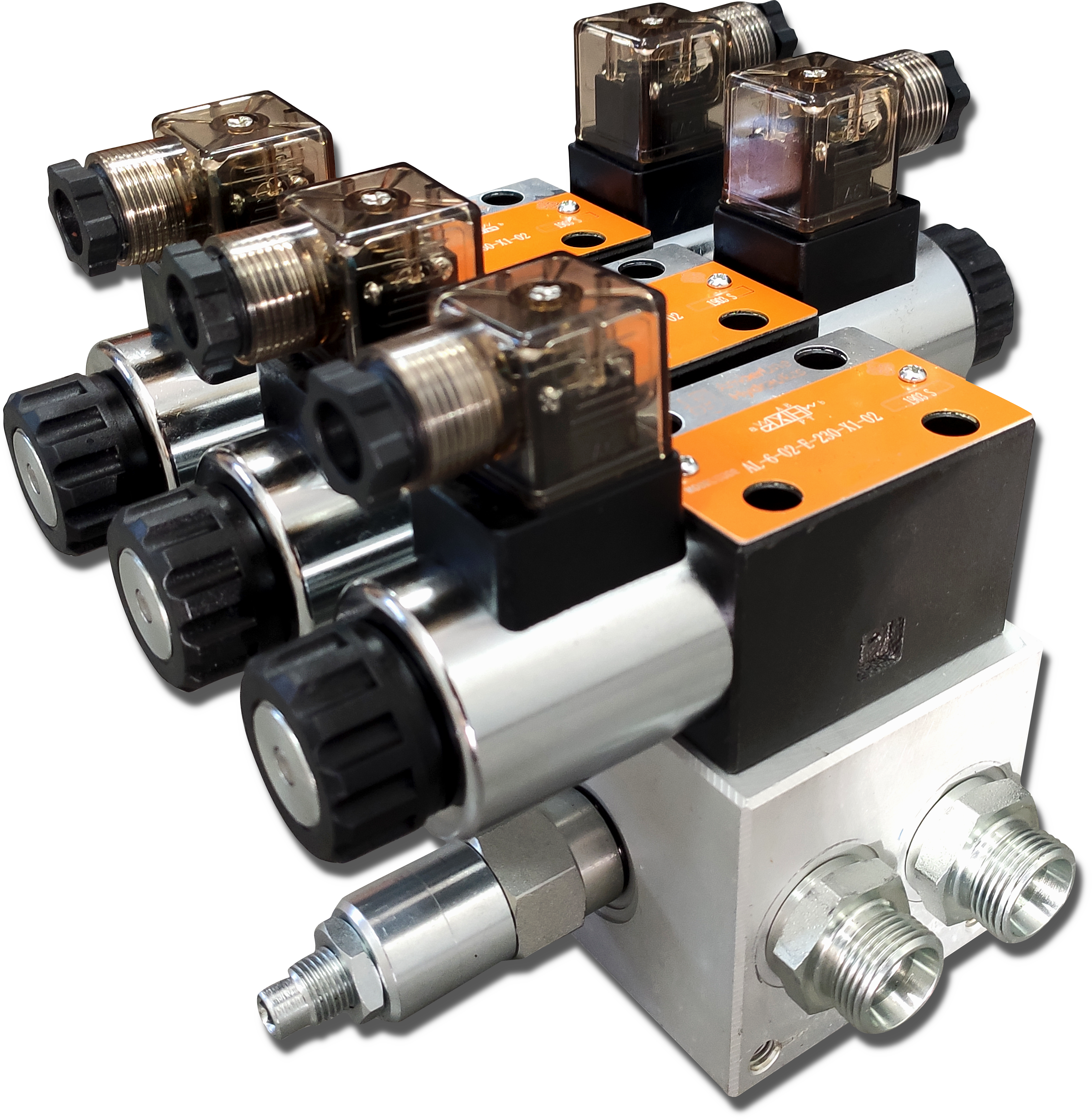 Rozdzielacz hydrauliczny z jedną sekcją startową (odciążającą) oraz 2 sekcjami roboczymi.