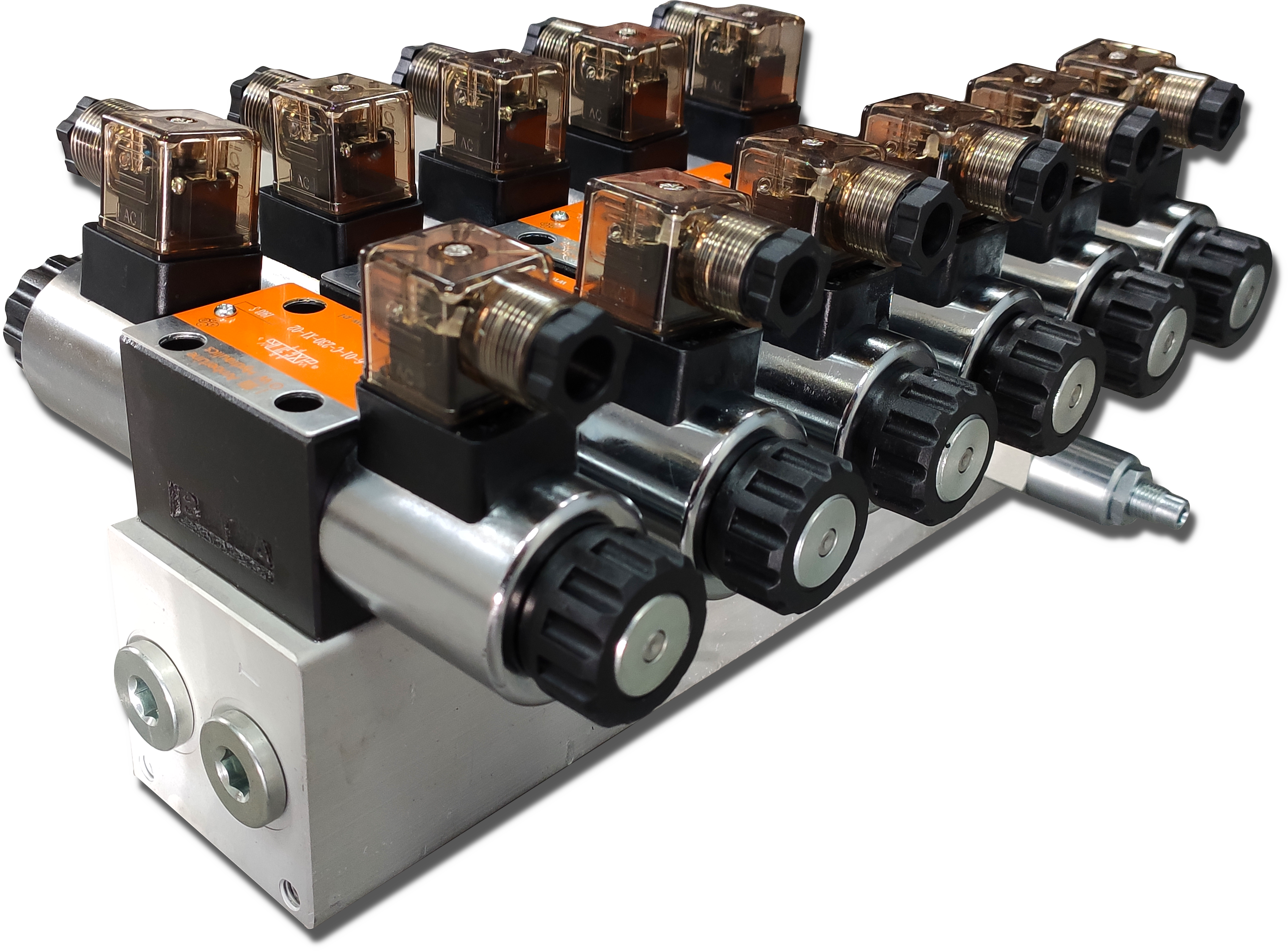 Rozdzielacz hydrauliczny z jedną sekcją startową (odciążającą) oraz 6 sekcjami roboczymi.