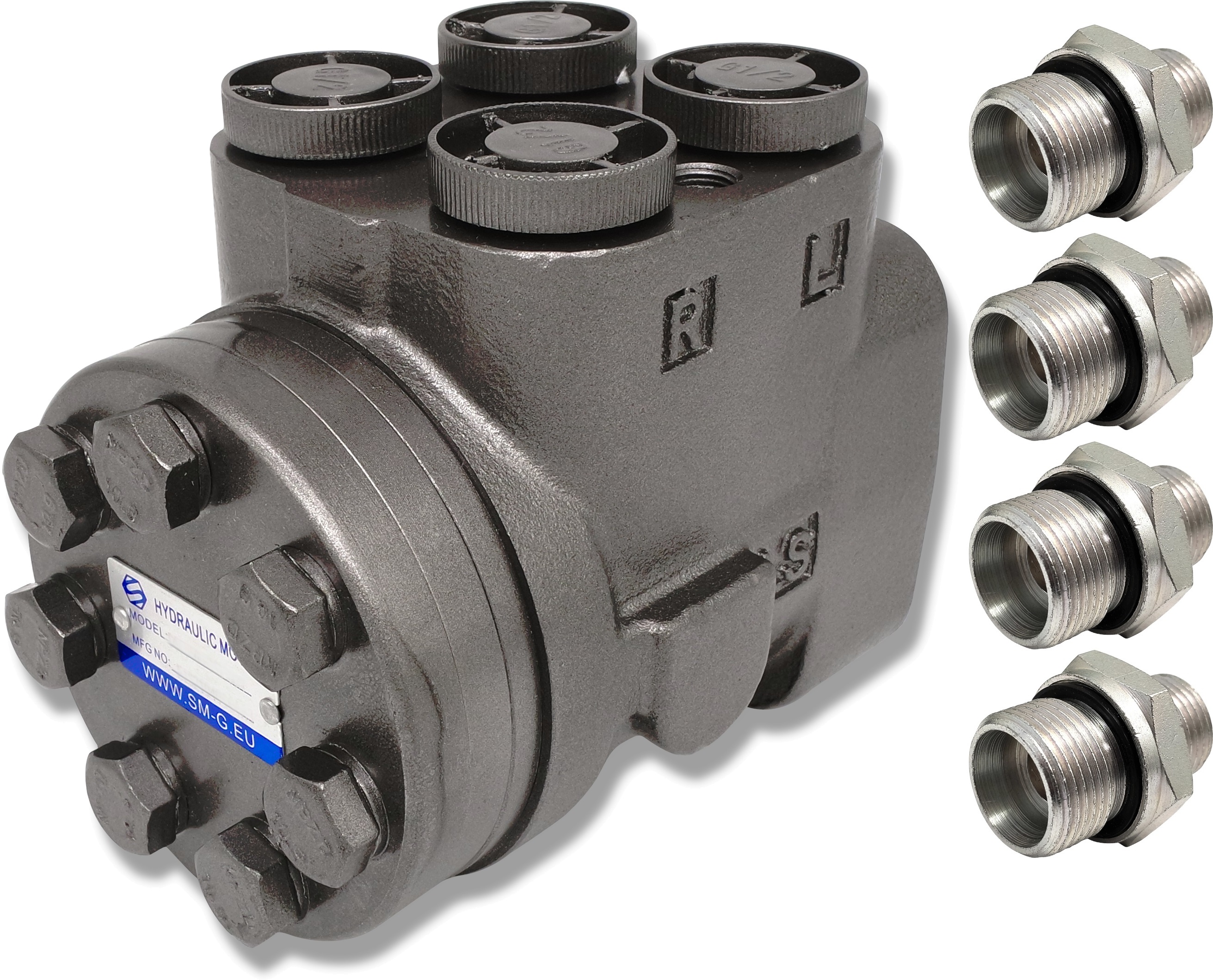 - Każdy orbitrol posiada opisane przyłącza: P, T, R, L, co zapewnia prawidłowe podłączenie do układu