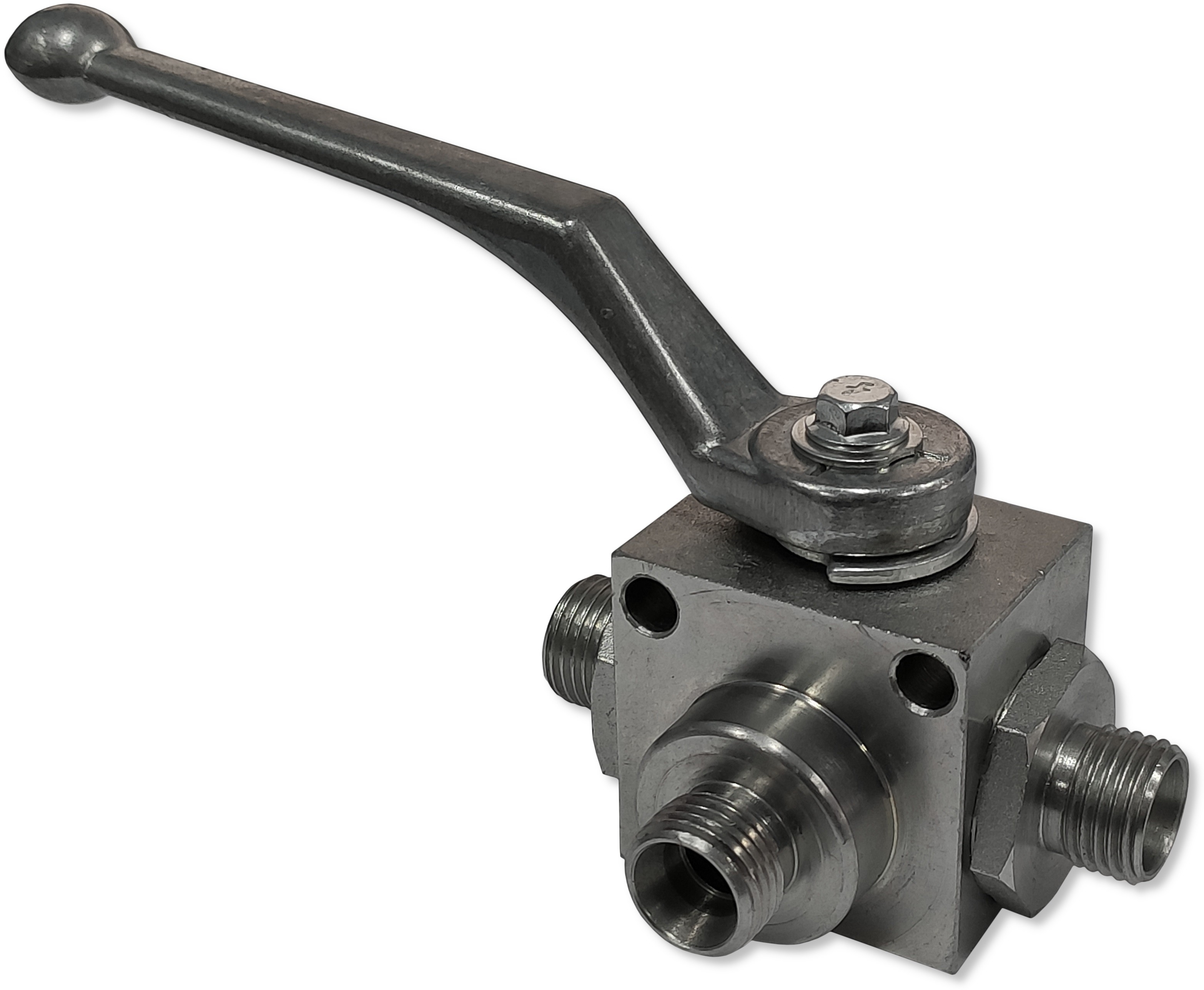Zawór kulowy wysokiego ciśnienia - obraca się o 90 stopni - służy głównie do zamykania, otwierania oraz regulowania kierunku przepływu cieczy (np. oleju hydraulicznego) między dwoma niezależnymi liniami hydraulicznymi w układzie hydraulicznym.