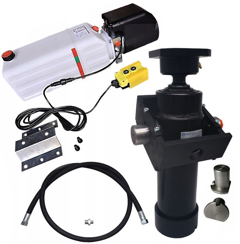 agregatem-pompą, siłownikiem hydraulicznym o skoku 700 mm.Zestaw doskonale sprawdza się w zabudowach z wywrotem w samochodach dostawczych, ciężarowych, lawetach i przyczepach.