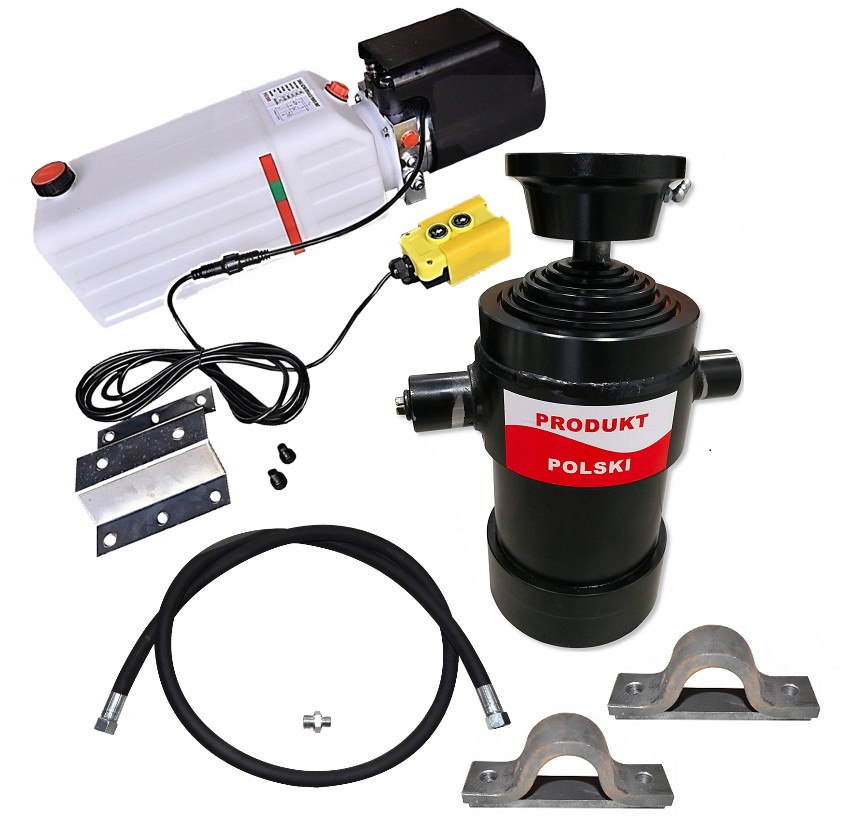 z agregatem-pompą, siłownikiem hydraulicznym polskim o skoku 1000 mm.Zestaw doskonale sprawdza się w zabudowach z wywrotem w samochodach dostawczych, ciężarowych, lawetach i przyczepach.