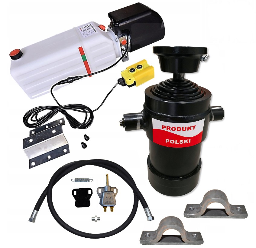 agregatem-pompą, siłownikiem hydraulicznym polskim o skoku 1000 mm.Zestaw doskonale sprawdza się w zabudowach z wywrotem w samochodach dostawczych, ciężarowych, lawetach i przyczepach.