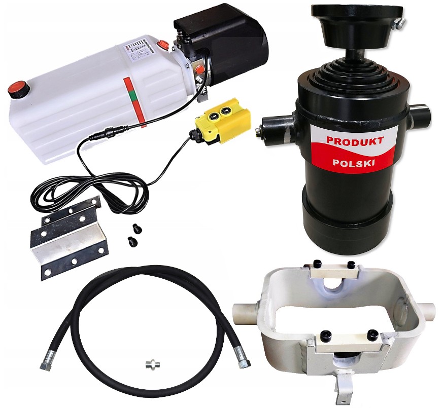 z agregatem-pompą, siłownikiem hydraulicznym polskim o skoku 1000 mm.Zestaw doskonale sprawdza się w zabudowach z wywrotem w samochodach dostawczych, ciężarowych, lawetach i przyczepach.