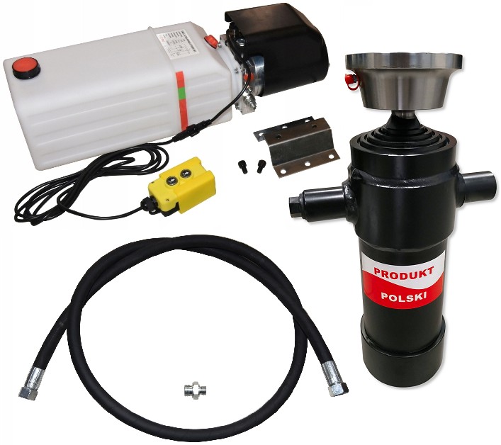 agregatem-pompą, siłownikiem hydraulicznym polskim o skoku 800 mm.Zestaw doskonale sprawdza się w zabudowach z wywrotem w samochodach dostawczych, ciężarowych, lawetach i przyczepach.