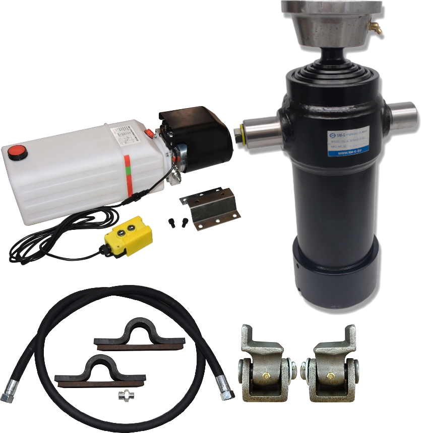 z agregatem-pompą, siłownikiem hydraulicznym o skoku 910 mm.Zestaw doskonale sprawdza się w zabudowach z wywrotem w samochodach dostawczych, ciężarowych, lawetach i przyczepach.